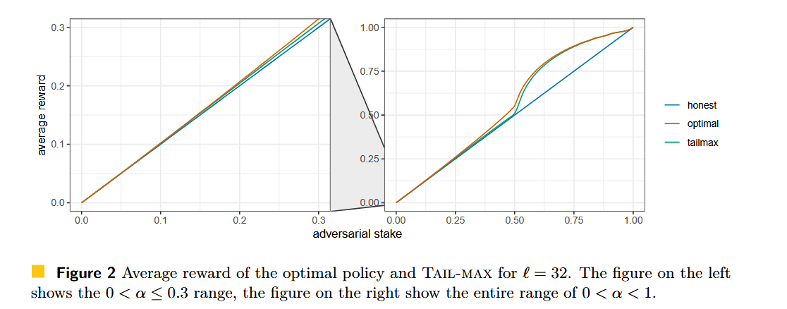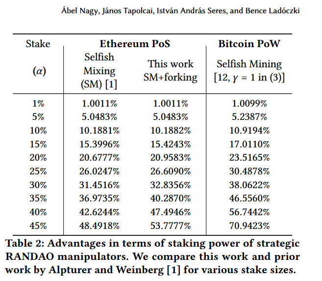 在 Forking the RANDAO: Manipulating Ethereum’s Distributed Randomness Beacon 中, Nagy 指出,攻击者在并未掌握尾部区块的前提下,可以通过 fork 诚实验证者的区块来选择更有利于自己的 RANDAO 结果。他们将这种情况和对应的策略加入到马尔可夫过程中,进一步降低了攻击的发动条件,他们得到的结果相比于前一篇工作有所提高,但都只在攻击者的质押占比较高时能为攻击者带来值得关注的额外收益。