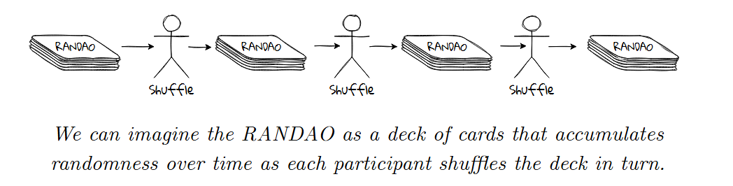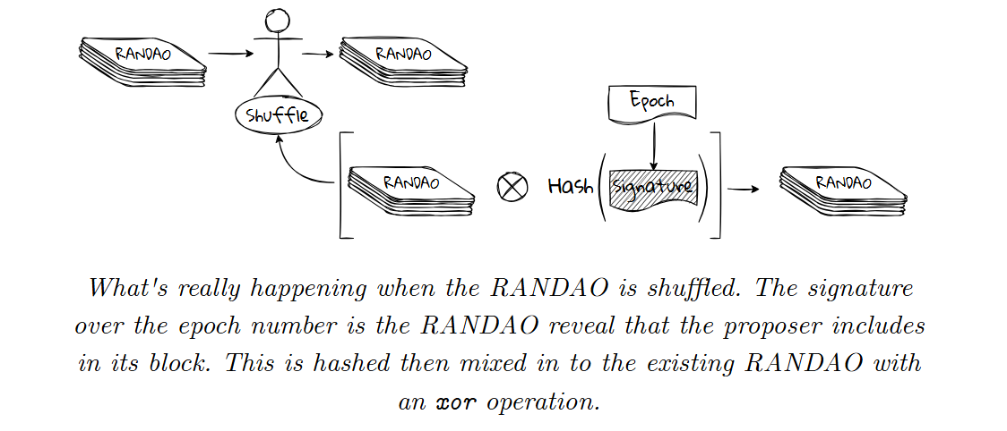 这一过程所采用的算法被称为 RANDAO,我们可以将其看作在一个 epoch 中累加随机性的工具。epoch 中每一个被提出的区块会为最终的结果提供一些助力。毕竟这样的随机性也需要共识,哪为什么不顺便将它和其他需要共识的东西塞到一起呢?